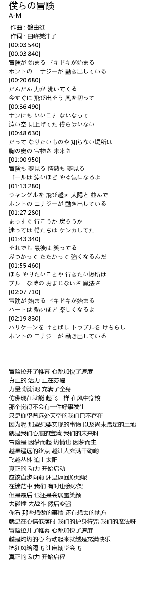 | [00:06.460] | 冒険が 始まる ドキドキが始まる |