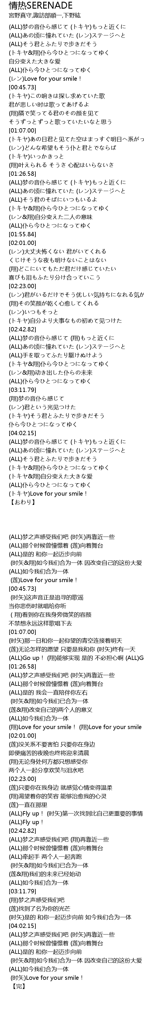 | [04:18.99] | (トキヤ&翔)仆ら今ひとつになってゆく (トキヤ&翔)自分变えた大きな爱 |