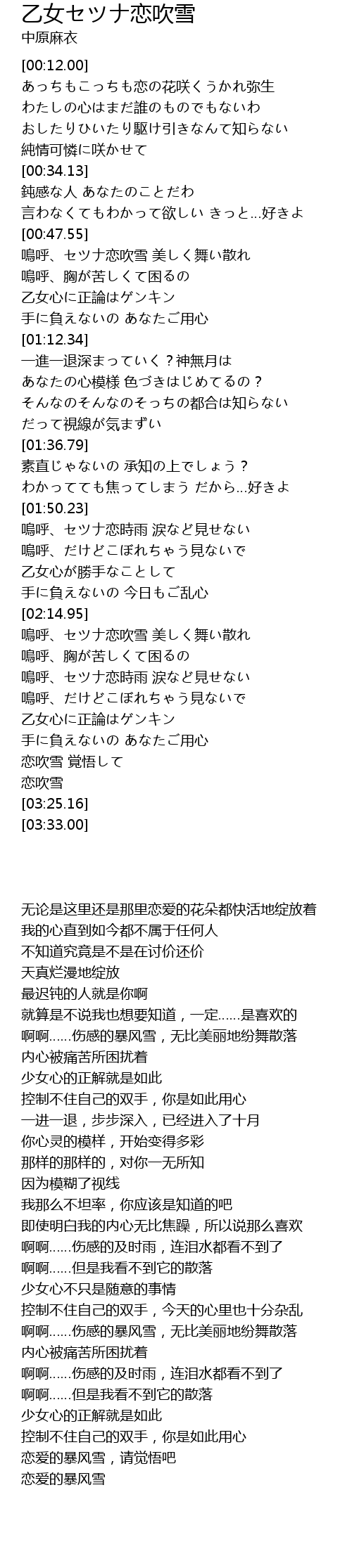 | [02:39.53] | 嗚呼、セツナ恋吹雪 美しく舞い散れ |