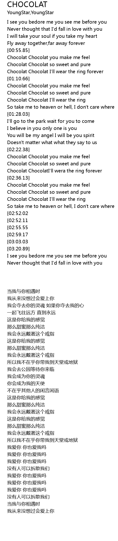 | [02:30.51] | Chocolat ChocolatI' ll wera the ring forever |