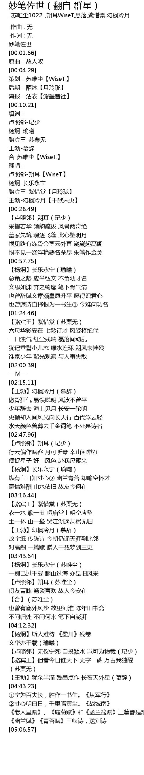 | [04:33.74] | 【王勃】犹余半滴 残墨点作 长夜天外星(慕辞) |