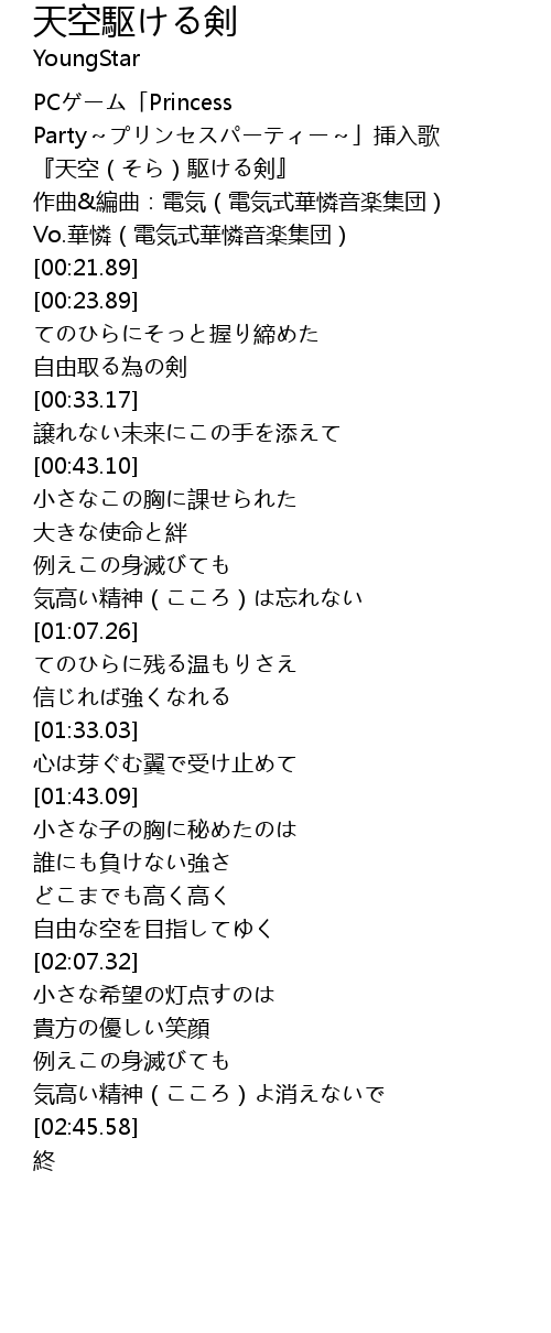 | [00:05.89] | 『天空(そら)駆ける剣』 |