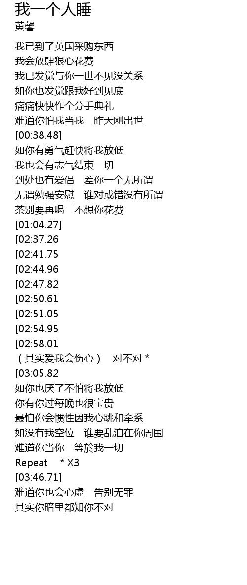 | [03:17.69][02:37.26][02:10.69][01:05.25] | *忘了告诉你 我已惯了一个睡 |