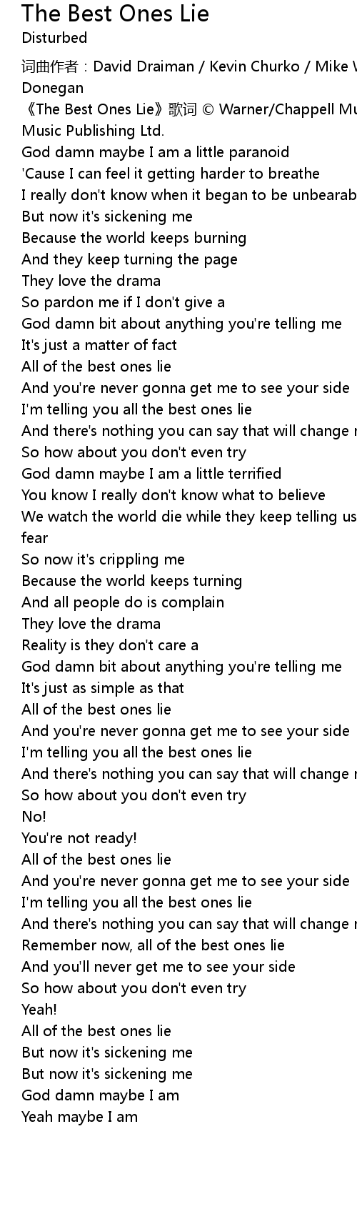 | [00:06.50] | The Best Ones Lie gē cí Warner Chappell Music, Inc, Kobalt Music Publishing Ltd. |