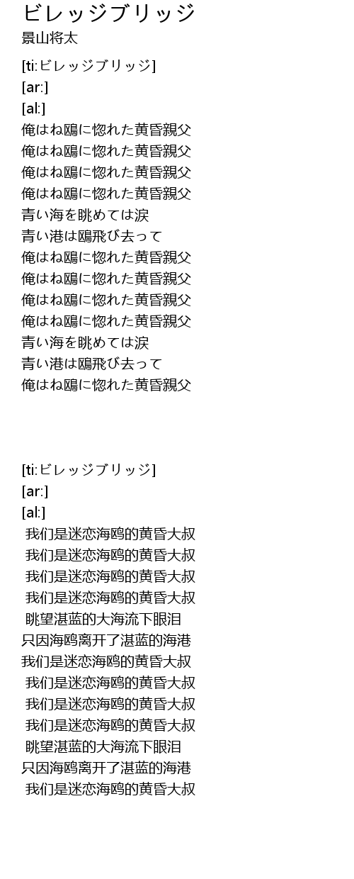 | [00:38.07] | 俺はね鴎に惚れた黄昏親父 |