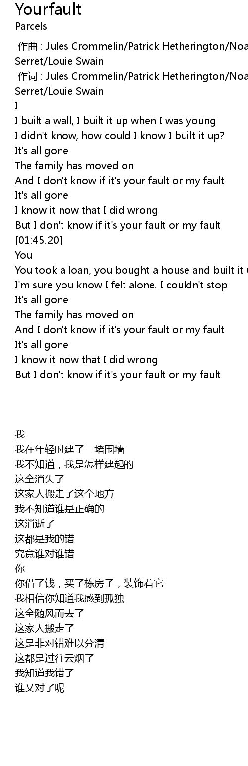 | [01:41.35] | But I don' t know if it' s your fault or my fault |