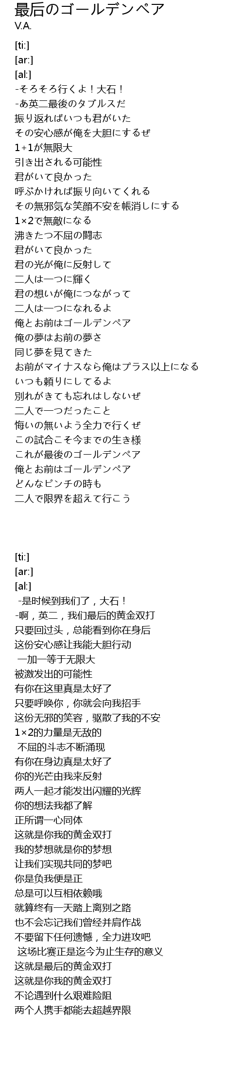 | [02:14.38] | 俺とお前はゴールデンペア |