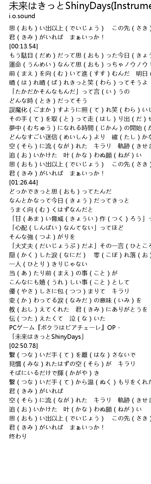 | [02:38.49] | PCゲーム『ボクラはピアチェーレ』OP - 「未来はきっとShinyDays」 |