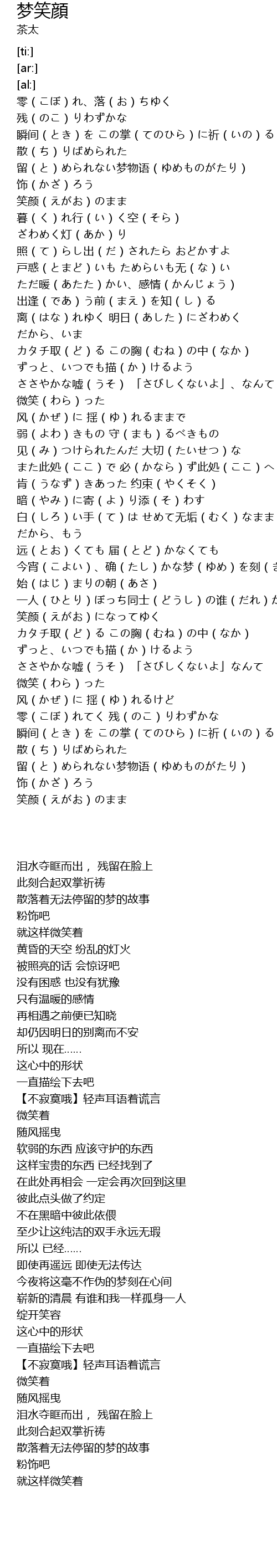| [03:48.43] | 散(ち)りばめられた 留(と)められない梦物语(ゆめものがたり) |