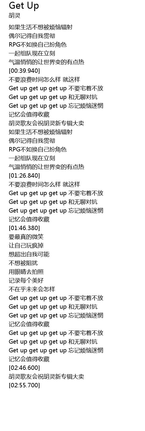 | [01:39.180] | Get up get up get up 忘记烦恼迷惘 |
