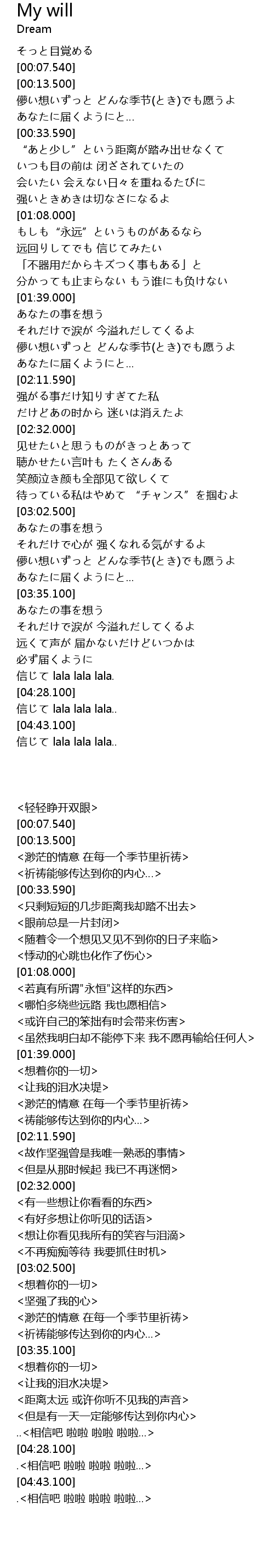 | [03:19.100] | 儚い想いずっと どんな季节(とき)でも愿うよ |