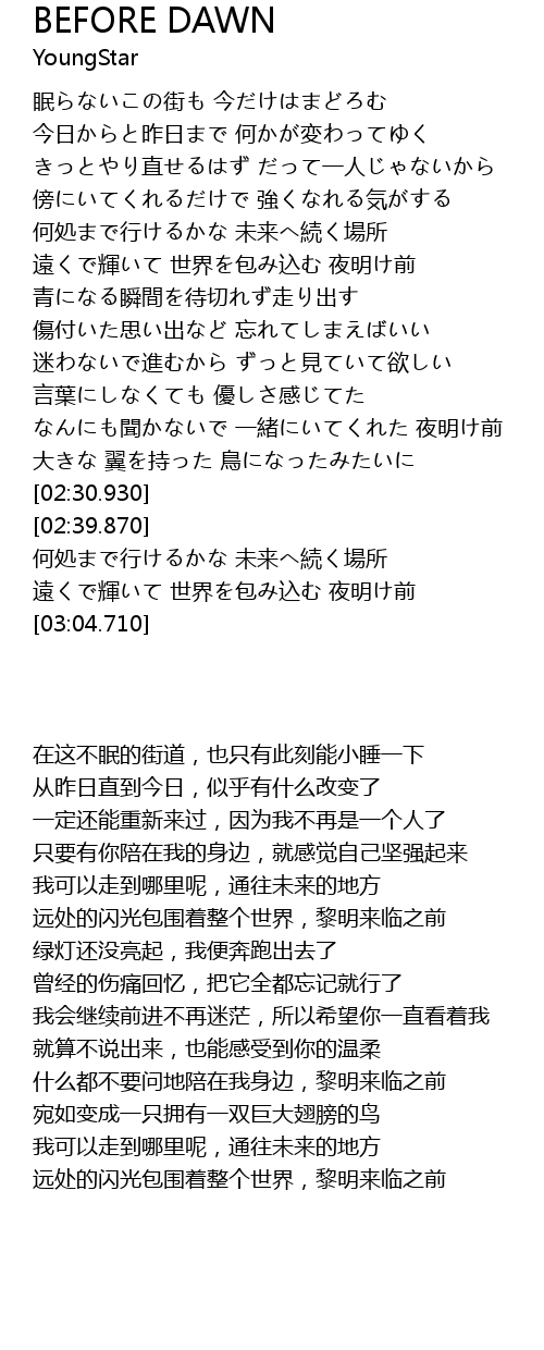 | [02:53.450] | 遠くで輝いて 世界を包み込む 夜明け前 |