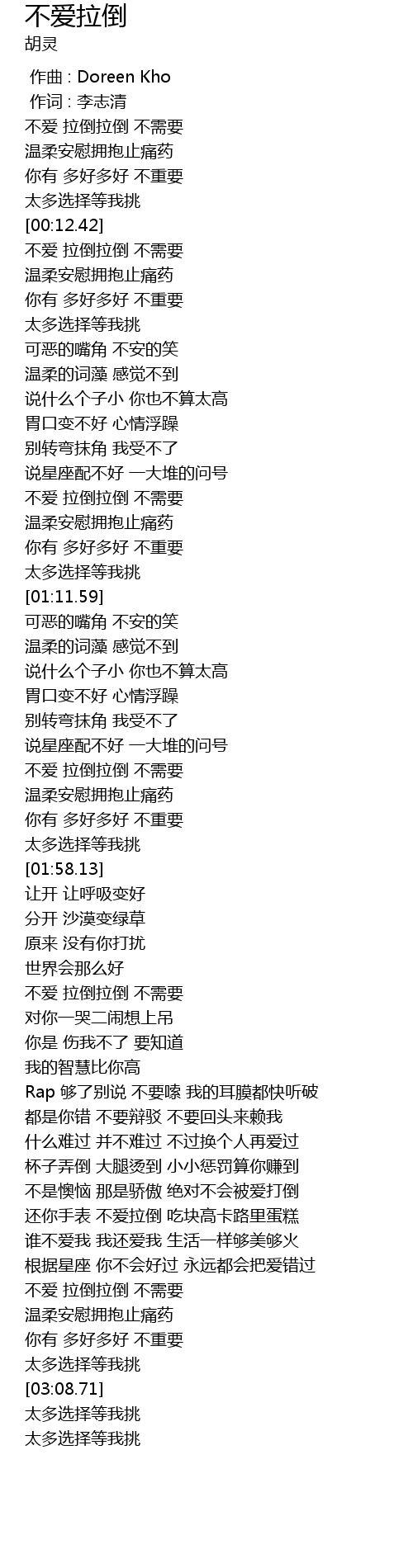 | [00:01.43] | 不爱 拉倒拉倒 不需要 |