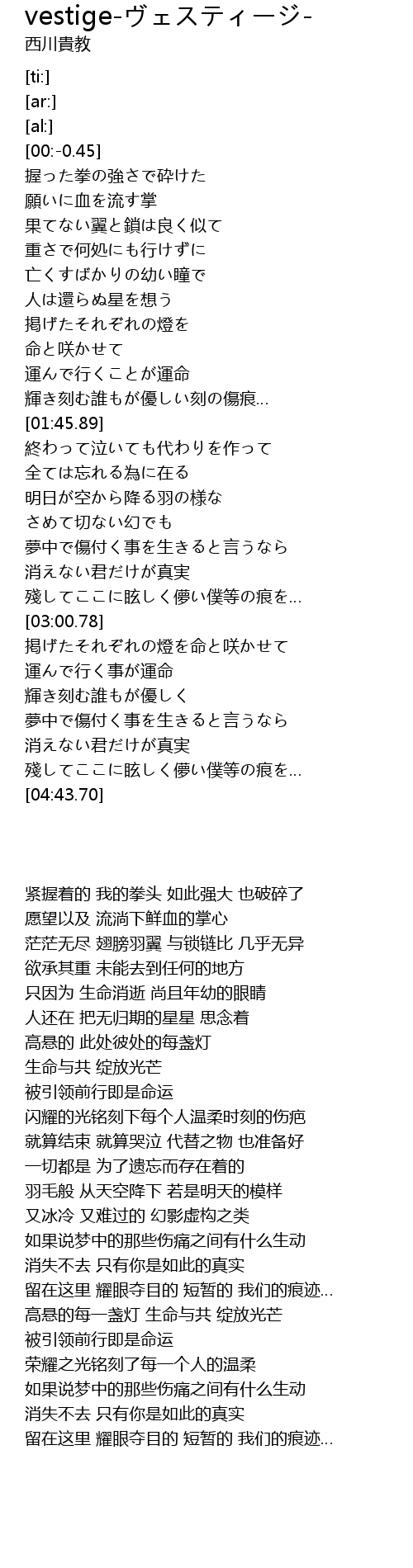 | [02:43.39] | 殘してここに眩しく儚い僕等の痕を… |