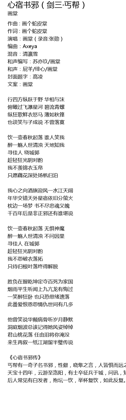 | 天宝十四年,云游至洛阳,有士卒征兵于城,问讯,知其故。书邪曰:“生于山水者,不尝闻战事,然家国存亡,当尽己之力!”答曰:“善。”于是同赴前线。血战天策,心宿遭重创,寻医,谓时日不多矣。女言之曰:“此生得子为友,实无憾。事已至此,天命不可违,惟愿反乡。”携之反,三日而绝,葬于君山。 | |