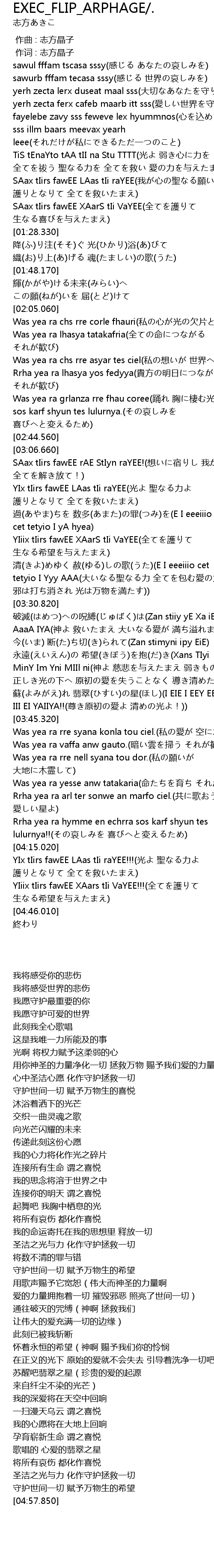 | [03:16.520] | YIx tIirs fawEE LAas tIi raYEE(光よ 聖なる力よ 護りとなりて 全てを救いたまえ) |
