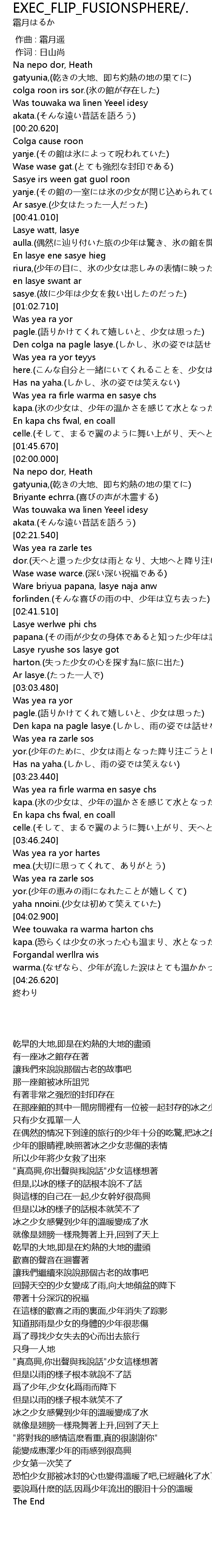 | [03:33.750] | En kapa chs fwal, en coall celle.(そして、まるで翼のように舞い上がり、天へと還った) |
