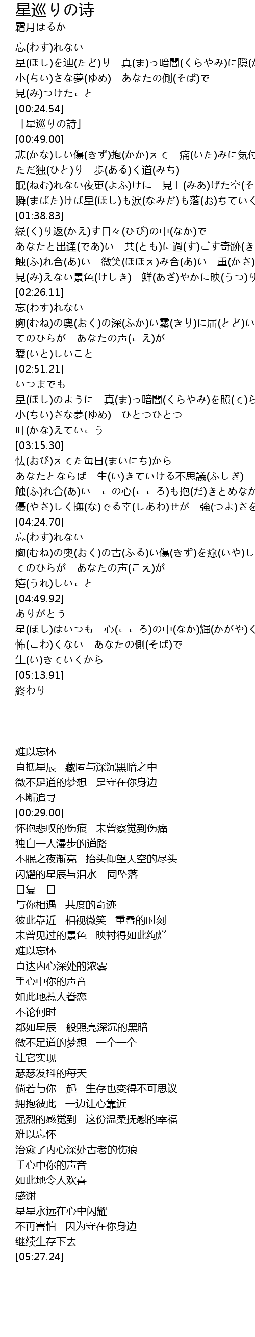| [04:53.40] | 星(ほし)はいつも 心(こころ)の中(なか)輝(かがや)く |