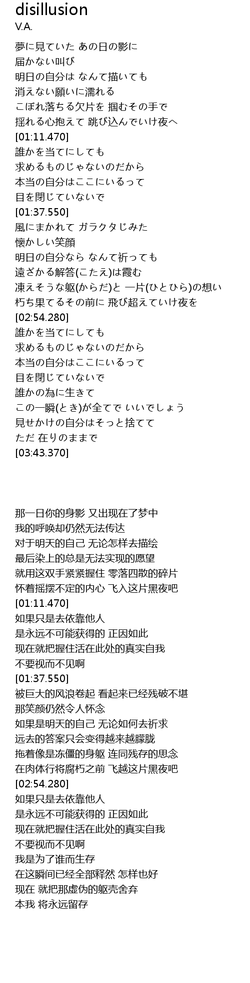 | [02:32.650] | 凍えそうな躯(からだ)と 一片(ひとひら)の想い |