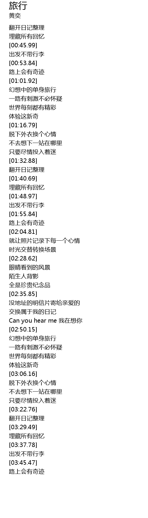 | [02:51.63] | huàn xiǎng zhōng de dān shēn lǚ xíng |