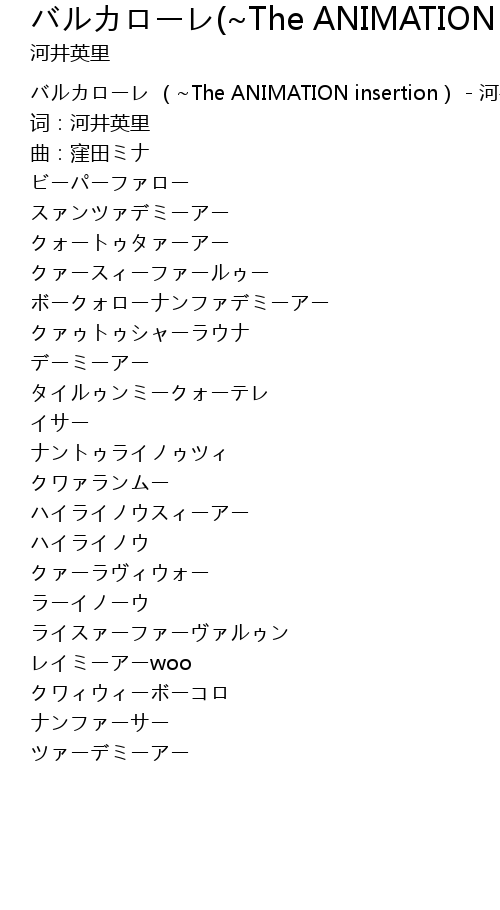| [00:00.100] | バルカローレ (~The ANIMATION insertion) - 河井英里 |