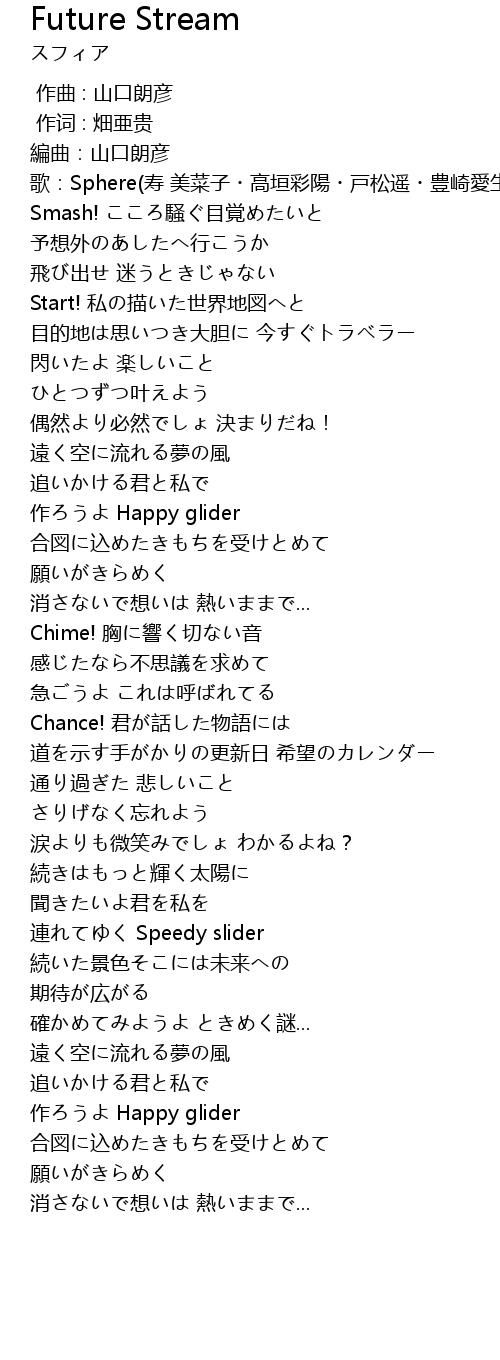 | [00:10.25] | 歌:Sphere(寿 美菜子・高垣彩陽・戸松遥・豊崎愛生) |