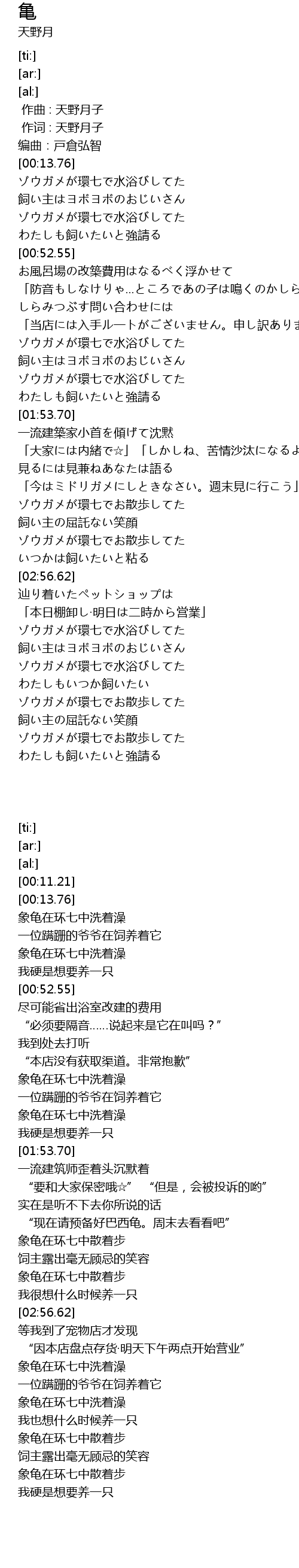 | [02:22.75] | 「今はミドリガメにしときなさい。週末見に行こう」 |