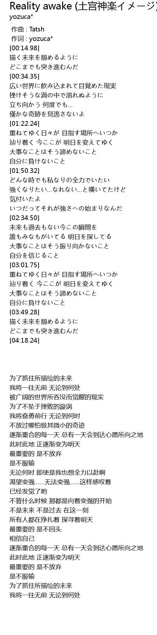| [00:49.39] | 広い世界に飲み込まれて目覚めた現実 |