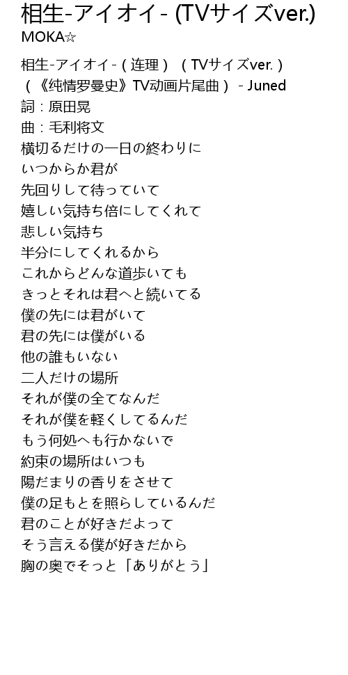 | [00:00.331] | 相生-アイオイ-(连理) (TVサイズver.) (《纯情罗曼史》TV动画片尾曲) - Juned |