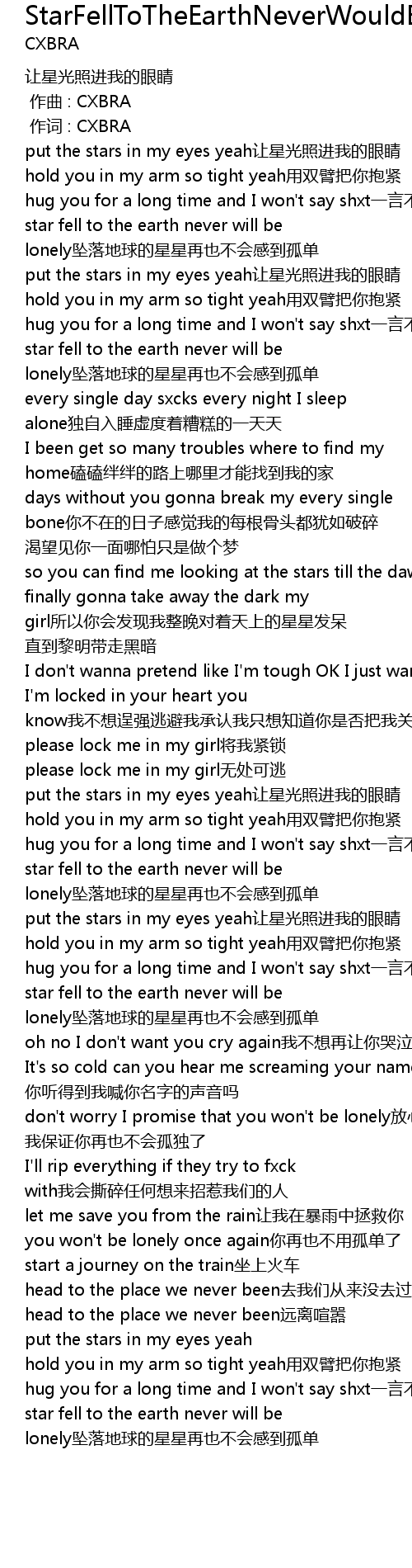| [01:38.500] | star fell to the earth never will be lonely坠落地球的星星再也不会感到孤单 |