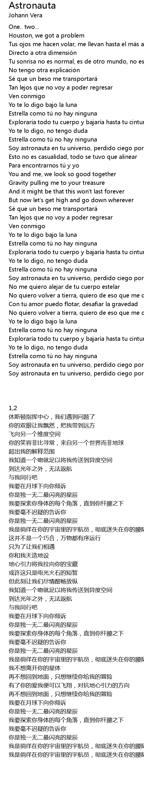 | [02:04.27] | Soy astronauta en tu universo, perdido ciego por tu cintura |