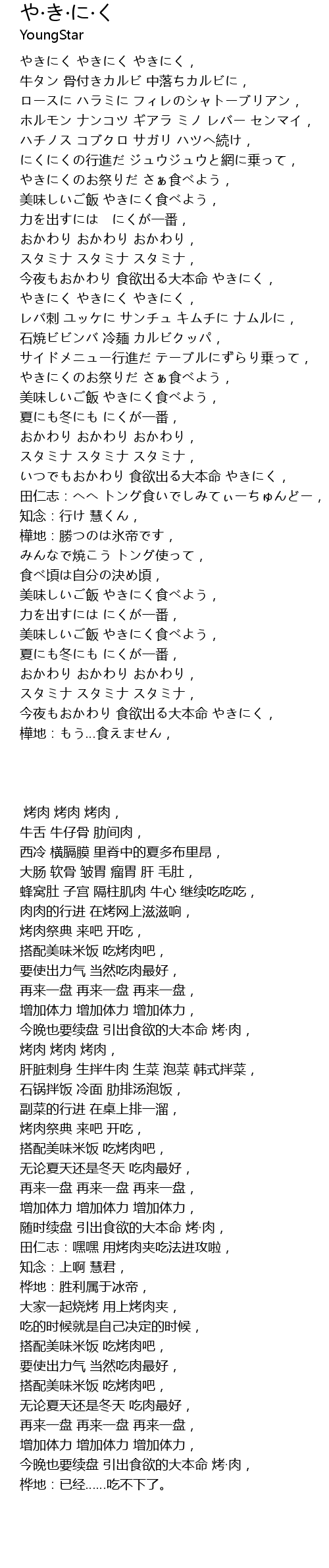 | [00:52.76] | やきにくのお祭りだ さぁ食べよう, |
