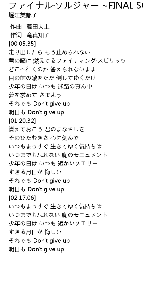 | [00:33.42] | 君の瞳に 燃えてるファイティング·スピリッツ |