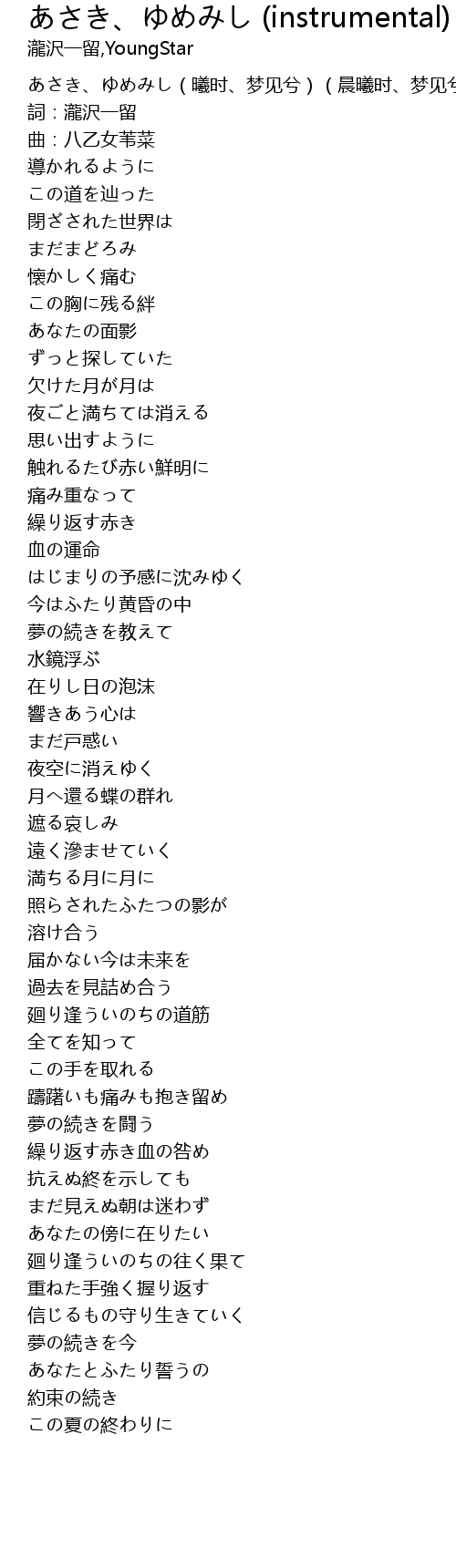 | [00:00.00] | あさき、ゆめみし(曦时、梦见兮)(晨曦时、梦见兮》游戏主题曲)-瀧沢一留 |