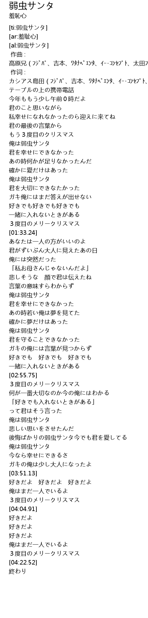 | [03:29.95] | 後悔ばかりの弱虫サンタ今でも君を愛してる |