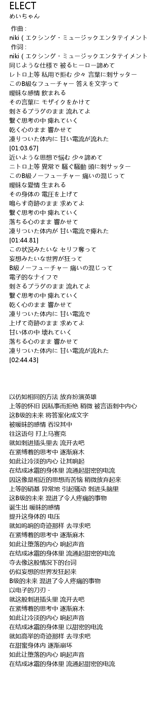 | [00:01.000] | 作词 : niki(エクシング・ミュージックエンタテイメント 第二事業部) |