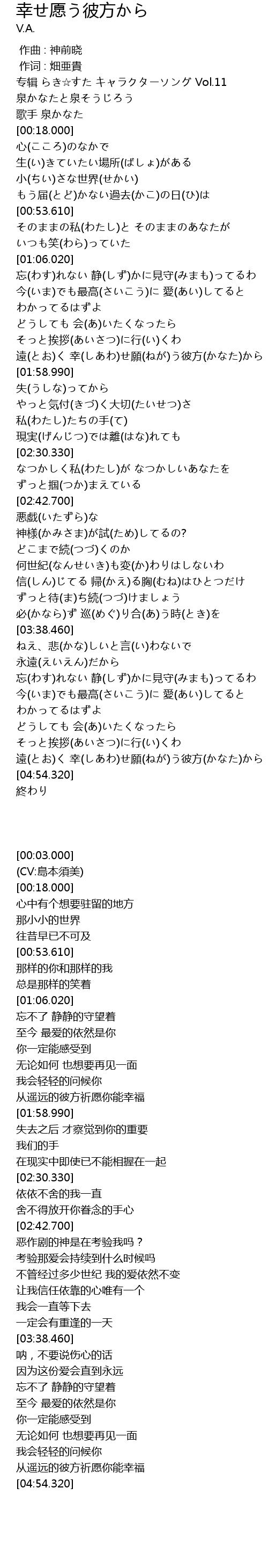 | [01:47.320] | 遠(とお)く 幸(しあわ)せ願(ねが)う彼方(かなた)から |