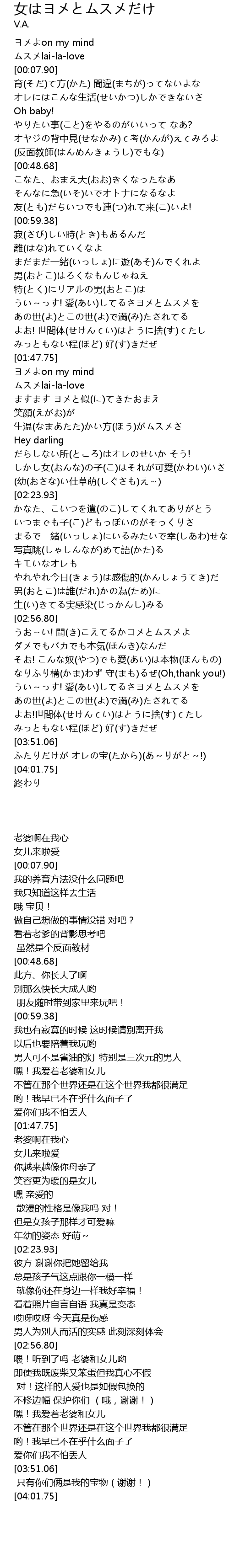 | [01:15.29] | 男(おとこ)はろくなもんじゃねえ 特(とく)にリアルの男(おとこ)は |