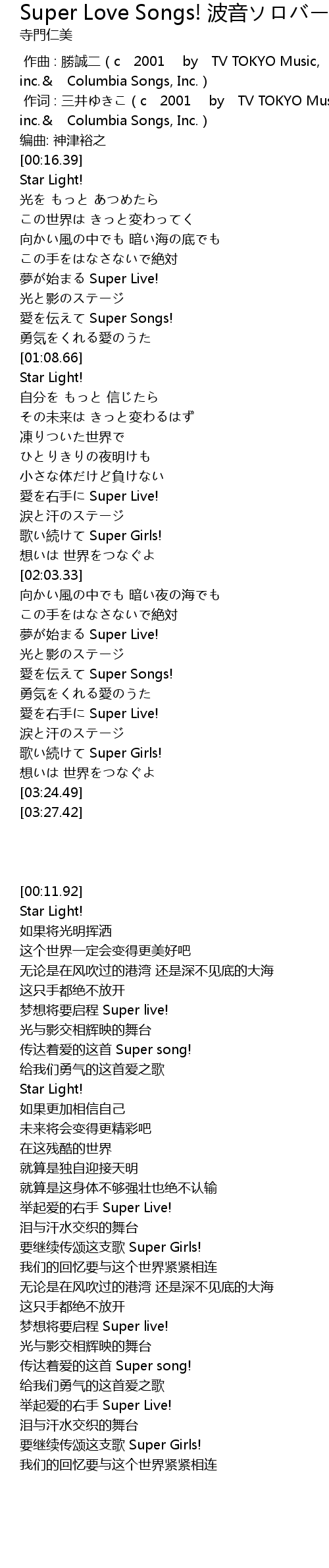| [00:01.000] | zuò cí : sān jǐng c 2001 by TV TOKYO Music, inc. Columbia Songs, Inc. |