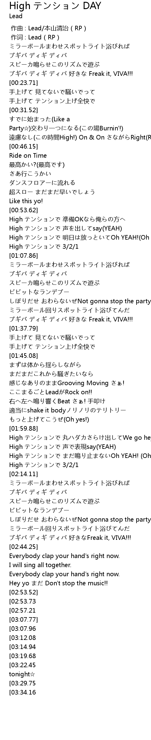 | [02:07.39] | High テンションで まだ鳴り止まないOh YEAH! (Oh YEAH!!) |