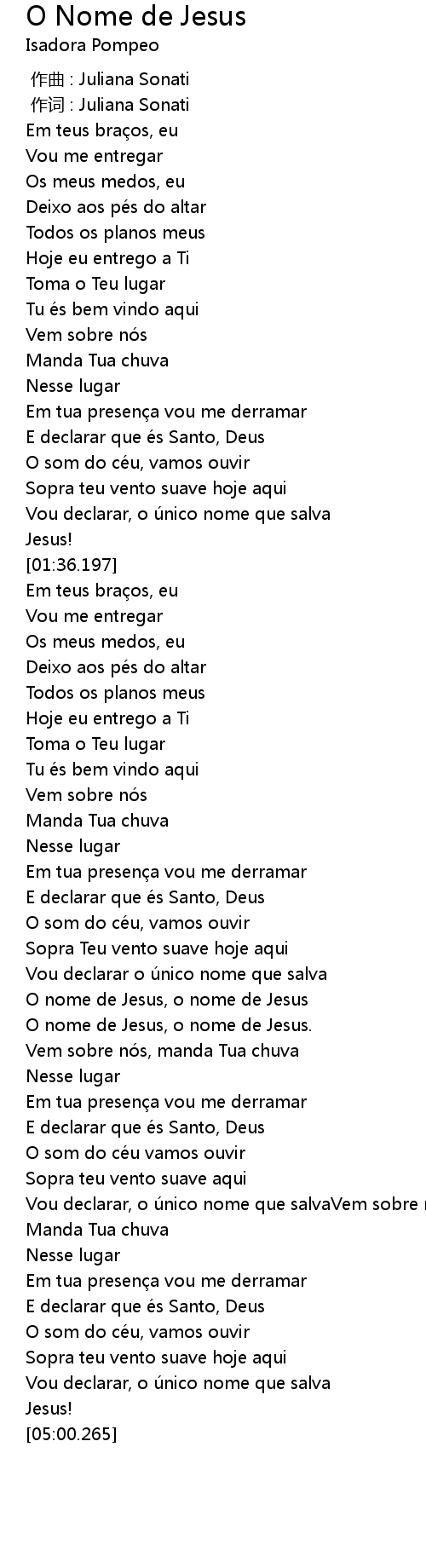 | [03:05.161] | O nome de Jesus, o nome de Jesus. |