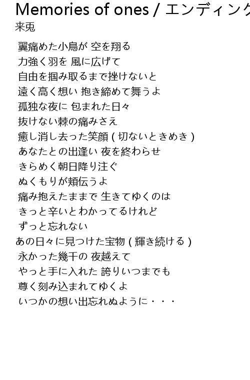 | [01:12.154] | ずっと忘れない あの日々に見つけた宝物(輝き続ける) |