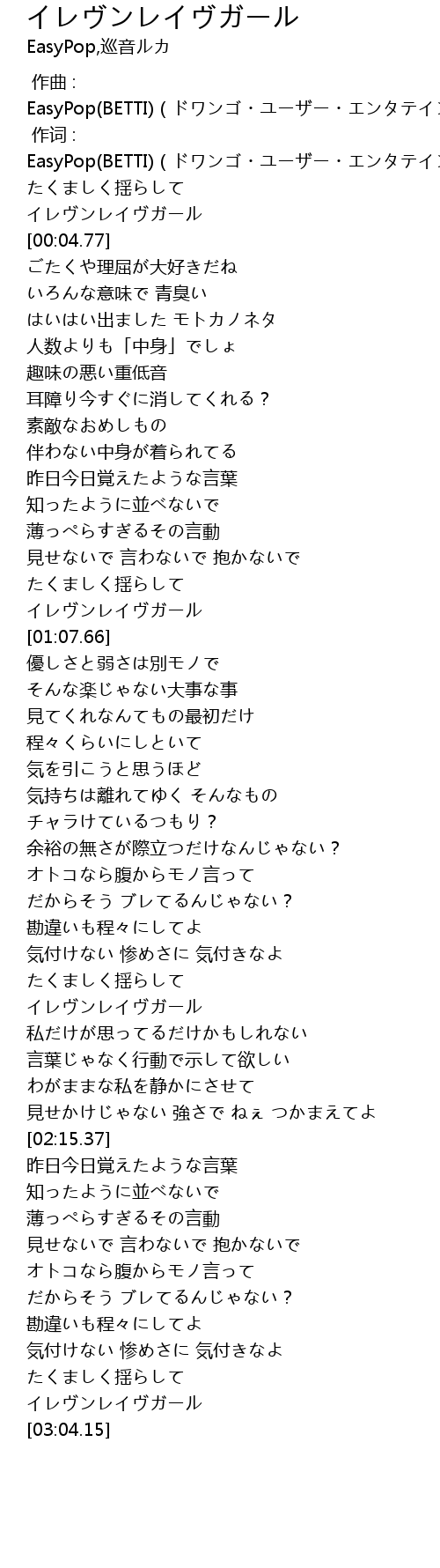 | [00:00.000] | 作曲 : EasyPop(BETTI)(ドワンゴ・ユーザー・エンタテインメント第2事業部) |