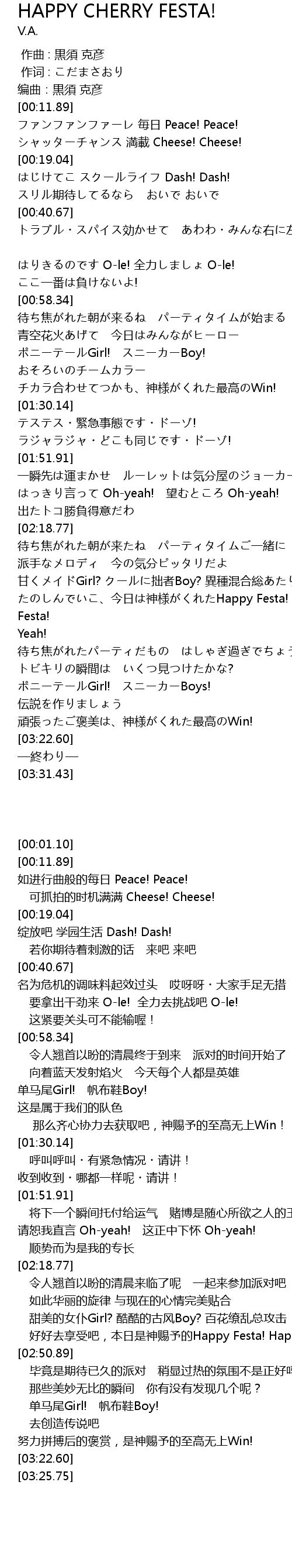 | [02:42.16] | たのしんでいこ、今日は神様がくれたHappy Festa! Happy Festa! |
