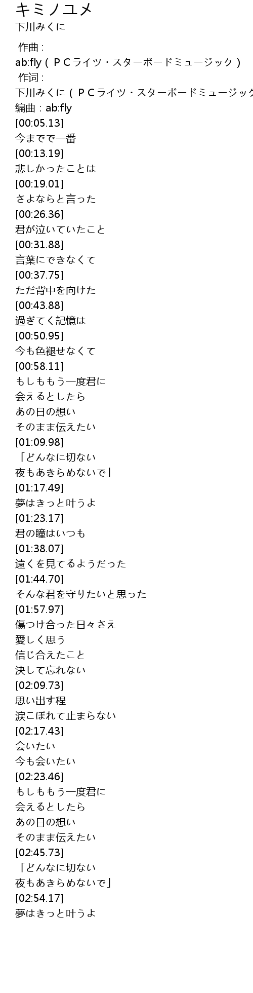 | [00:00.671] | 作词 : 下川みくに(PCライツ・スターボードミュージック) |