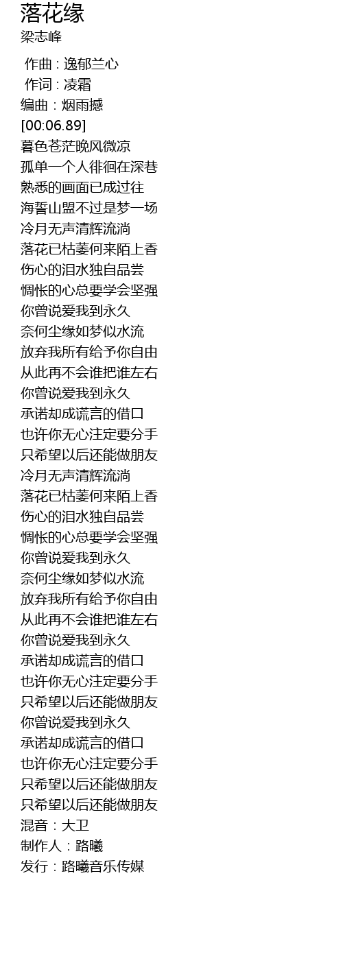 | [03:39.15] | yě xǔ nǐ wú xīn zhù dìng yào fēn shǒu |