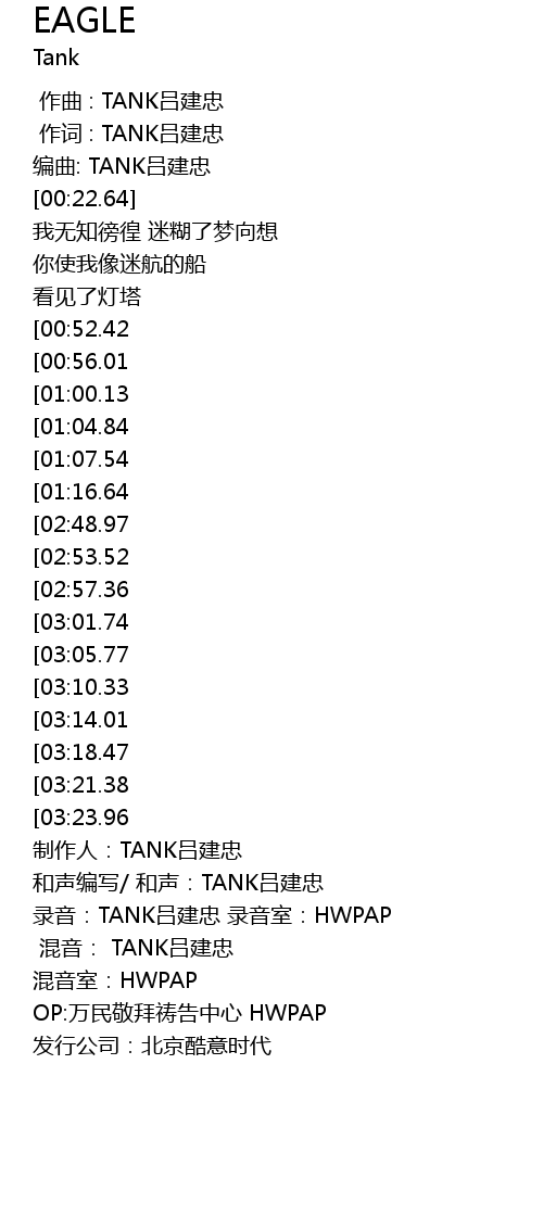 | [04:03.35] | 录音:TANK吕建忠 录音室:HWPAP |