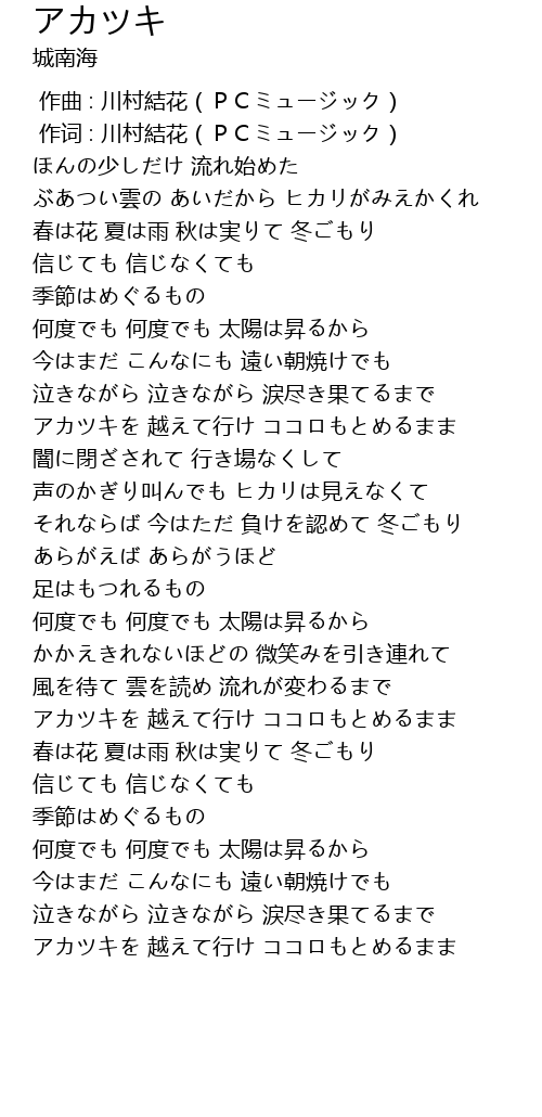 | [03:42.97] | アカツキを 越えて行け ココロもとめるまま |