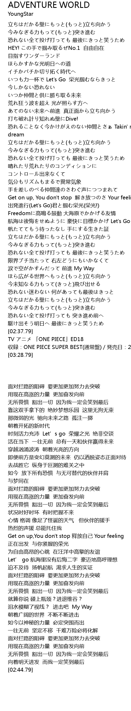 | [02:49.79] | 収録:ONE PIECE SUPER BEST(通常盤)/発売日:2007/03/07 |