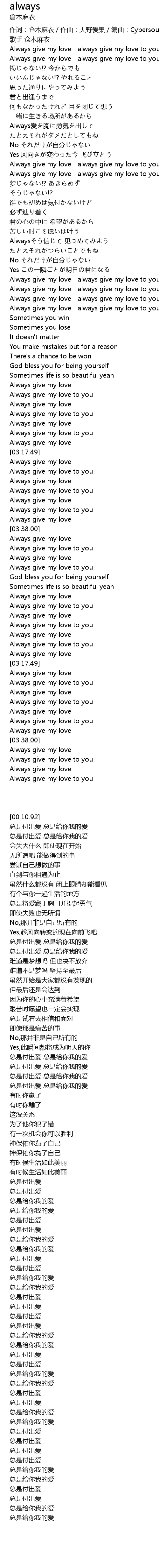 | [00:04.00] | 作词:仓木麻衣/作曲:大野爱果/编曲:Cybersound |